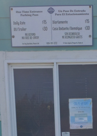 As of this writing, the fee is $15.00 per car or $30.00 per RV or a car with a trailer.